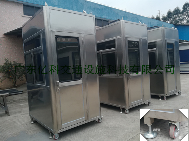 這款不銹鋼復式收費亭-51采用304不銹鋼板制作的,底座上安裝有4個(gè)腳輪方便人手推動(dòng),腳輪旁相應安裝了支撐腳座,可上下微調高度。支撐腳座能減少腳輪單獨承重重量,從而延長(cháng)滑輪的使用壽命。